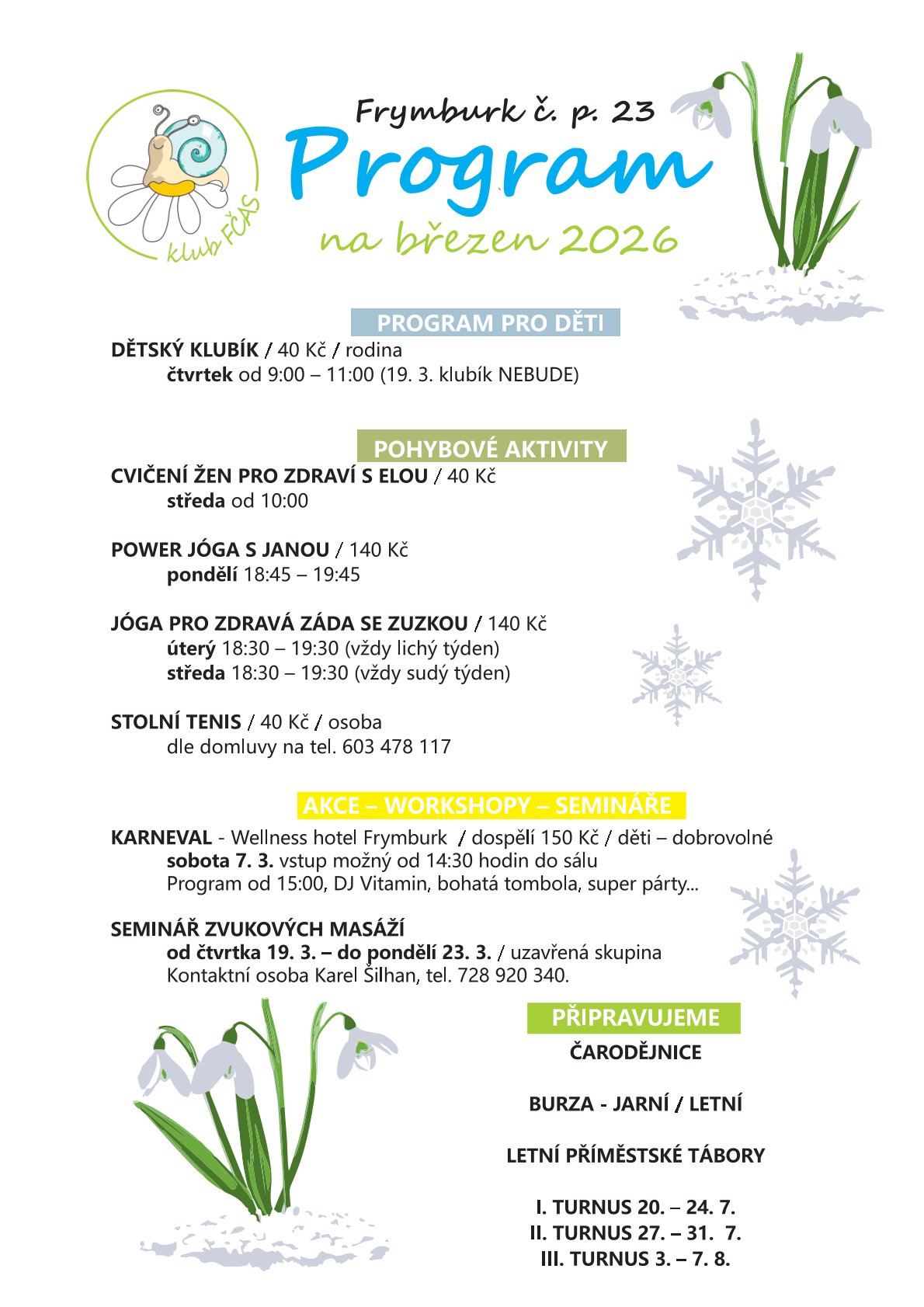Březen se nese ve znamení karnevalu. Ve FČASu ale běží i další program. Přijďte si zacvičit nebo užít zvukové masáže.